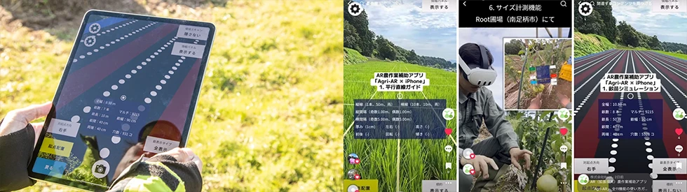 左)タブレットを用い「Agri-AR」を使用した際の様子 右)「Agri-AR」上に表示されるさまざまな機能のデモ画面。左から、デバイスに農場を写すだけで平行直線やサイズの穴開きマルチを配置する「平行直線ガイド」、作物の大きさを測る「サイズ計測」、仮想の畝などを現実空間上でシミュレーションできる「畝・苗シミュレーション」