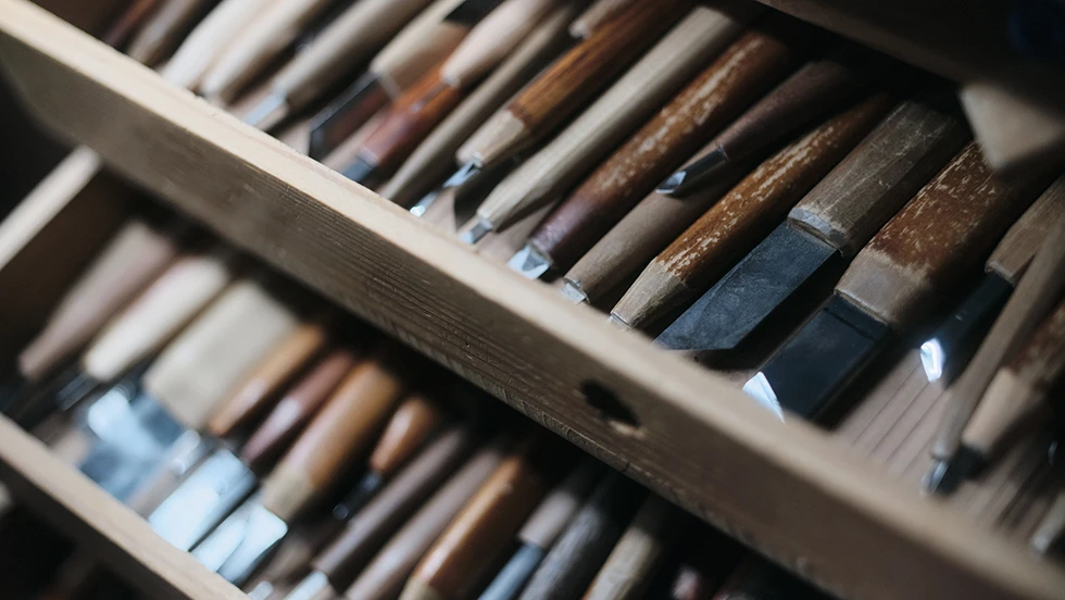 我休さんが「この刃でしか彫れない」と語る彫刻刀は、兵庫県・三木市の職人の手によるもの。現在70代半ばの職人には後継者がいないため、向こう30年分の彫刻刀を注文したという
