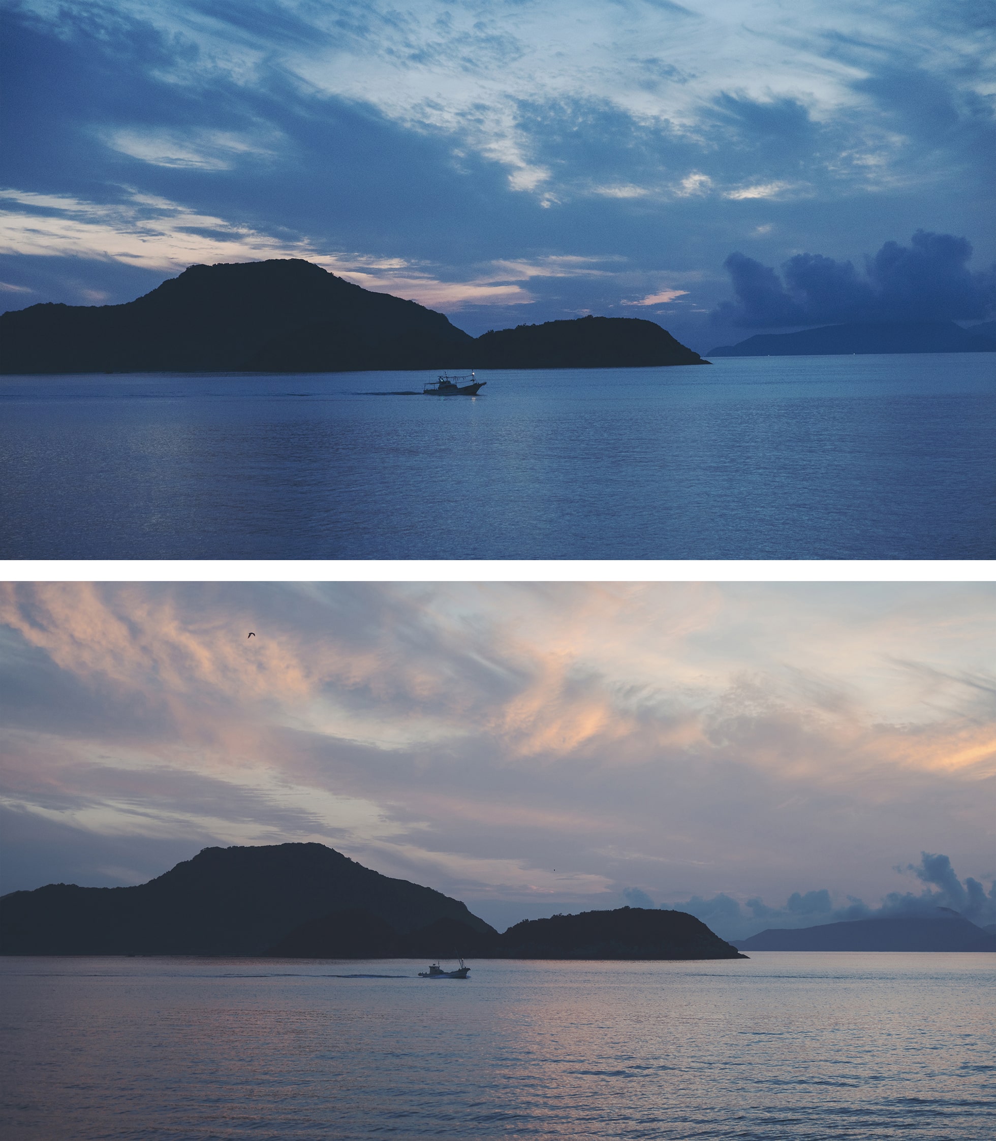 西の空がほんのり赤く色づいて、島々の影が少しずつ暗くなる。