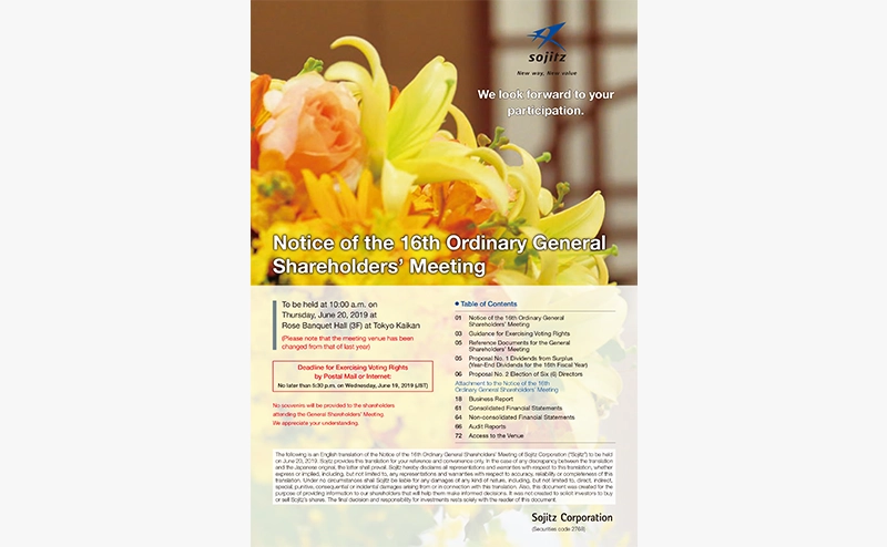 This Website was created for the purpose of providing information relating to Sojitz corporation. It was not created to solicit investors to buy or sell Sojitz Corporation's stock. The final decision and responsibility for investments rests solely with the user of this Website and its content.