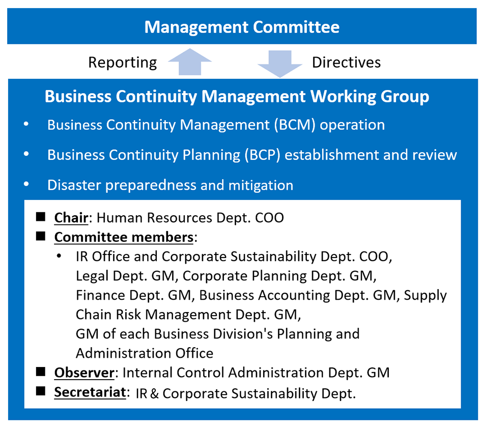 In the event of a crisis, Sojitz has established internal systems and roles based on the Sojitz Group Basic Crisis Management Policy and the Sojitz Crisis Management Guidelines. Sojitz has also established the Business Continuity Management Working Group, an organization chaired by the Human Capital Department COO, which regularly reports to the Management Committee. The working group continuously reviews and implements improvements to all crisis-related measures in order to ensure their effectiveness and respond to changes in the business environment.