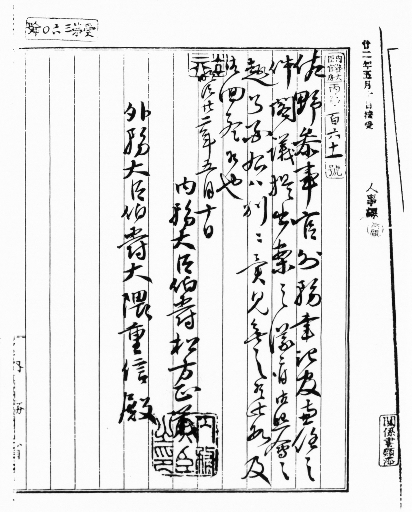 【日本綿花】 佐野常樹の外務書記官任命書(大隈重信・松方正義の署名により交付)