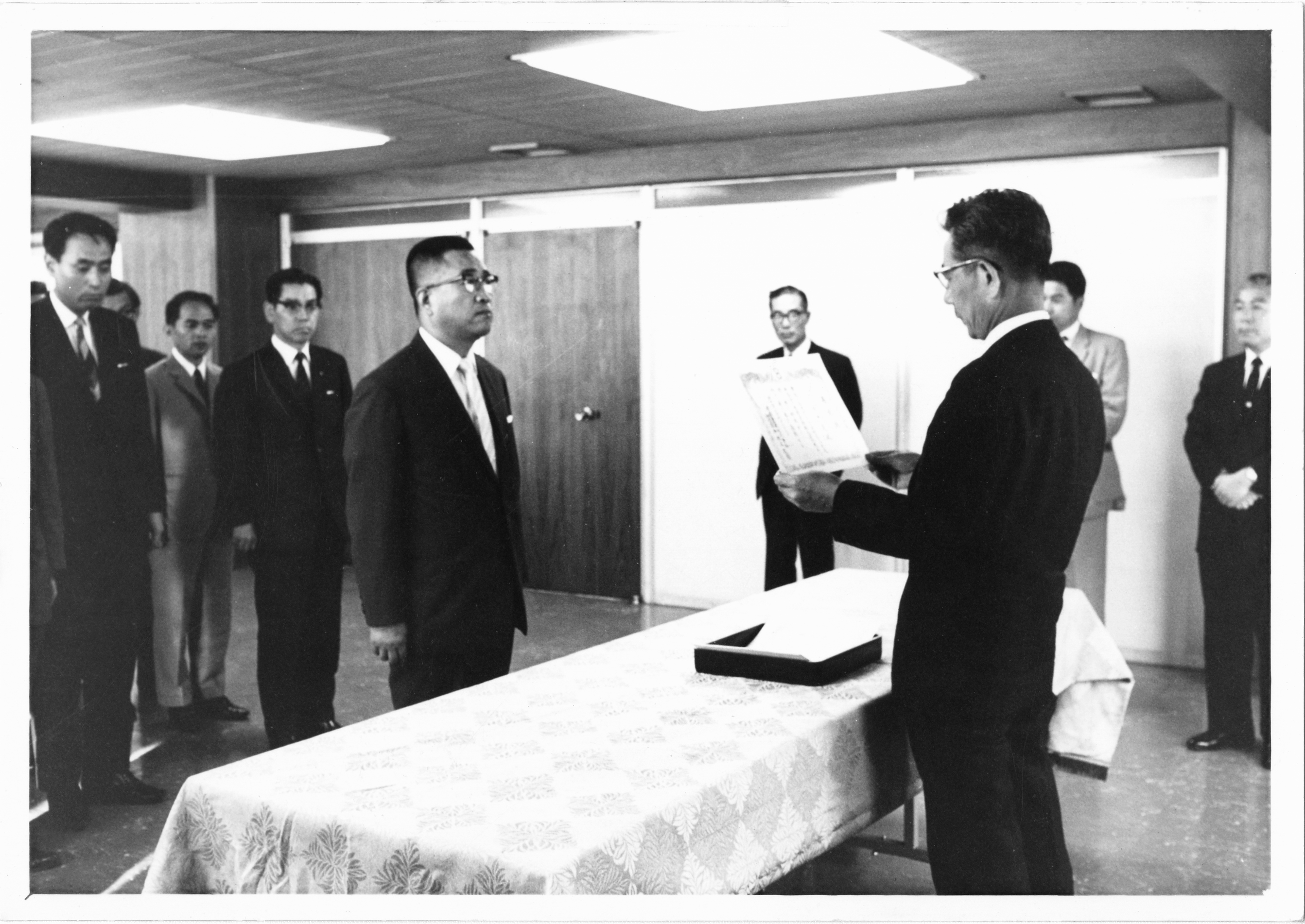 【日綿實業・ニチメン】神林社長から表彰される鉄鋼原料部関係者(1967年8月)