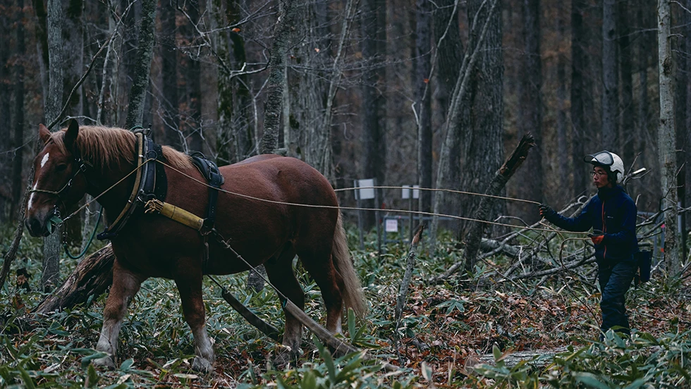 西埜さんはどのようにして進むべき道を見つけ、現在に至ったのでしょうか。北海道・厚真町にある「西埜馬搬」を訪ね、話を聞きました。