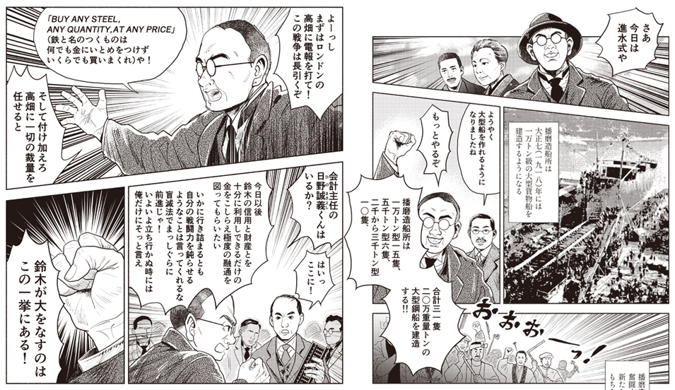 鈴木商店は、世界中に優秀な若手社員を派遣し、鈴木商店独自の通信網を構築していた。大戦が勃発すると、日々世界中から届けられる電報を見た金子直吉は、世界情勢と実需を見極め、「BUY ANY STEEL, ANY QUANTITY, AT ANY PRICE」(鉄と名のつくものは何でも金に糸目をつけずいくらでも買いまくれ)と大号令を発する。そして調達した鉄材で船舶を発注し、自ら造船業へ進出を画策するため川崎造船社長の松方幸次郎に相談する。