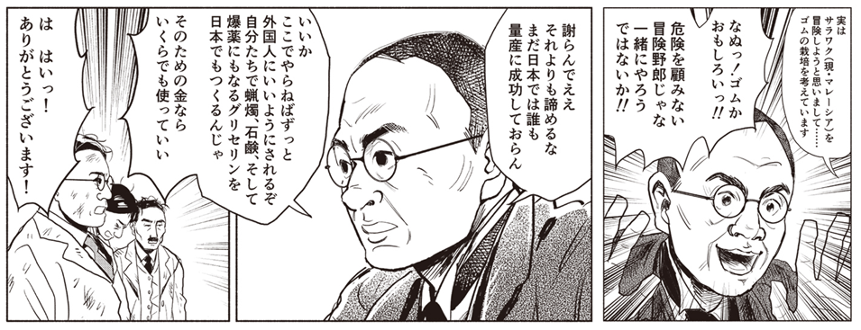 また、金子直吉は、冒険家の依岡省三と出会い、サラワク(現・マレーシアのサラワク州)でゴムの栽培事業に進出、神戸の敏馬にゴムの製造工場(現・ニチリン)も設立する。
