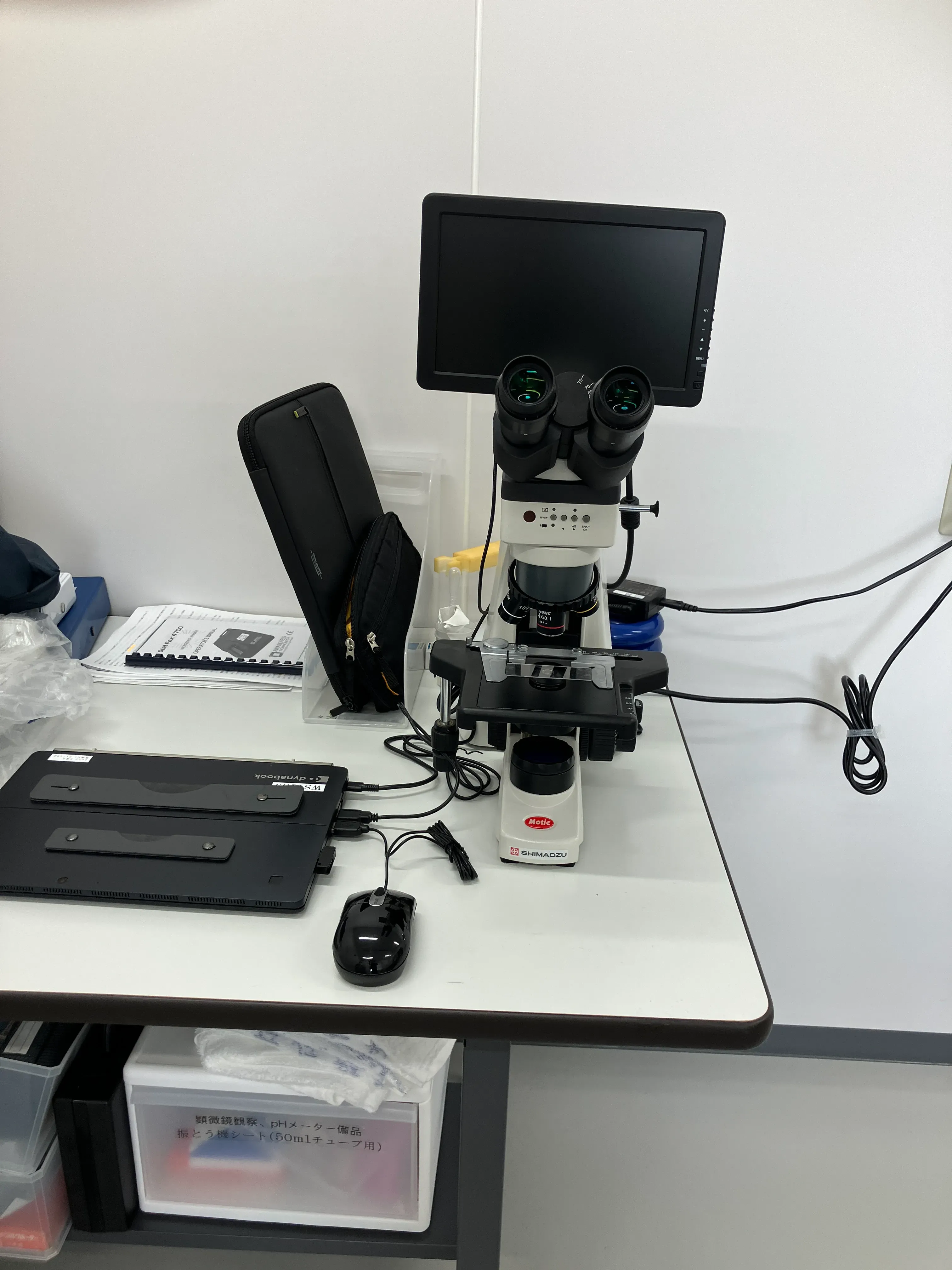 異物特定に使用する顕微鏡。PCと繋いでデータをバックアップし蓄積しています。
