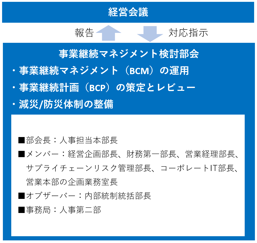 当社では、双日グループ危機管理基本方針、危機管理運営要領に基づき、有事の際の体制と役割を定めています。加えて人事担当本部長が部会長を務める「事業継続マネジメント検討部会」を設置し、定期的に経営会議に報告し、各種施策の実効性の担保と、経営環境の変化に対応すべく、継続的に見直し、改善、発展させています。